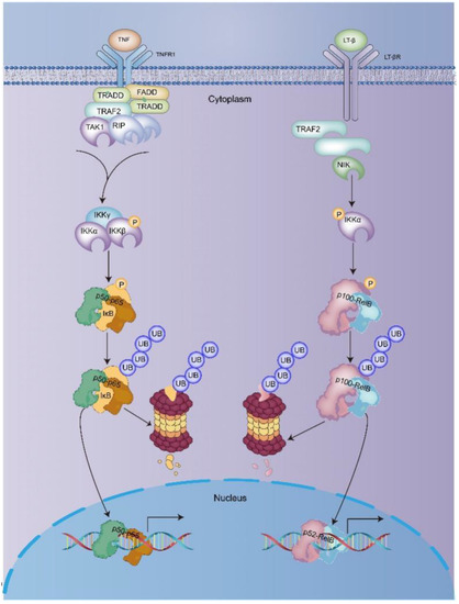 The canonical NF-κB signaling pathway mainly relies on IKKβ and NEMO, leading to phosphorylate IκBα on serine residues S32 and S36, which results in polyubiquitination and the subsequent degradation of IκB by 26S proteasomes [33,34] (Figure 2). Subsequently, the complex releases NF-κB (mainly the p50–p65 heterodimer), and the p50–p65 heterodimer translocates to the nucleus, binds the κB site, and activates gene transcription [35]. The intracellular signaling components mediating non-canonical NF-κB activation differ significantly from those involved in canonical NF-κB activation. In the non-canonical NF-κB signaling pathway, activation of receptor activators for nuclear factor kappa B (RANK), B-cell activation factor (BAFFR), lymphtoxin β-receptor (LTβR), or CD40, results in the activation of IKKα by the NIK [36]. The activation of IKKα can further the phosphorylate p100 on serine residues S870 and S866 [37,38]. The phosphorylation of p100 can lead to the polyubiquitination and degradation of p52 [39,40].