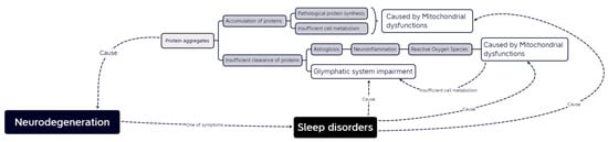 Sleep disorders seem to be inextricably linked to the process of neurodegeneration. This is consistent with the increased incidence of sleep disorders in the elderly and the increasing incidence of neurodegenerative disease in this age group [55]. Chronic sleep disorders are an integral part of neurodegenerative diseases, even being used as a predictor of disease [56]. These disorders, and in RBD, have been shown to cause impairment of both mitochondrial functions and the glymphatic system [57,61]. Furthermore, chronic sleep deprivation, including REM–SD, has been shown to cause abnormalities in mitochondrial morphology and bioenergetics and an increased accumulation of ROS markers, as well as a decreased concentration of numerous antioxidants [62]. Sleep disorders also affect the basic glymphatic system function of regulating CSF flow. The effects of sleep appear to be mainly through affecting cellular energy processes, which are required for the function of Na+/K+-ATPases [8].