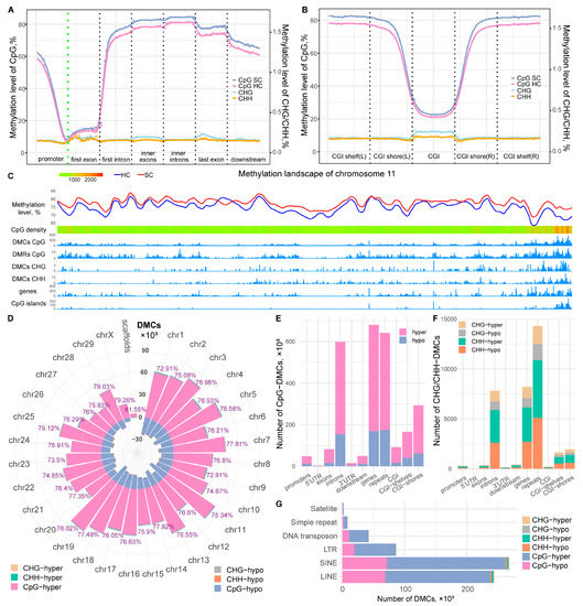 A comparison of DNA methylation profiles between SCP and HC groups revealed abundant differences. First, the global methylation level of CpG sites was significantly higher in the SCP group compared to the HC group in genic regions (Figure 1A,B and Table S2) and chromosomes (Figure 1C showing chromosome 11 as an example). Second, we identified about 2.17 million differentially methylated cytosine sites (DMCs) between SCP and HC, and more than 98% of them were CpG-DMCs (Table S3). Only 7494 and 22,860 DMCs were identified in the context of CHG and CHH, respectively (Table S4A,B). Consistent with the global higher methylation level in the SCP group, about 75% of CpG-DMCs and 50% of CHG-/CHH-DMCs were hyper-methylated in the SCP group (Table S5). Chromosomes 19, 11, and 5 are the top 3 chromosomes that harbored the most DMCs (more than 10 thousand DMCs) (Figure 1D and Table S5A). Moreover, the annotation of DMCs to genic structures indicated that the majority of DMCs (68%) are located in the intergenic regions (Table S5B). Among DMCs collocated with genic structures, introns harbored the most DMCs, followed by exons, downstream, and promoter regions (Figure 1E,F). Considering location in relation to CGI, most DMCs were found in CGI deserts, while CGI shores harbored more DMCs than CGI and CHI shelves (Figure 1E,F). Moreover, a high number of DMCs were also collocated with repeat elements, mostly short and long interspersed nuclear elements (SINE, LINE) and long terminal repeats retrotransposons (LTRs) (Figure 1G). In addition, we also identified a total of 58,965 differentially methylated regions (DMRs) based on CpGs by using a window size of 1 kb. About 80% of DMRs had higher methylation levels in the SCP group. DMRs showed a similar distribution with CpG-DMCs among genic structures and genomic regions (Table S6).