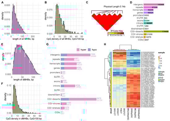 Characteristics of methylation haplotype blocks (MHBs). (A) Length distribution of all MHBs; (B) The distribution of CpG density in all MHBs; (C) Linkage disequilibrium (LD) score between CpG sites located in MHB chr1: 2,770,635–2,770,721 revealing the co-methylation status of adjacent CpG sites; (D) Count of MHBs that overlapped with genic regions and genomic regions; (E) Length distribution of differential MHBs (dMHBs); (F) The distribution of CpG density in dMHBs; (G) The dMHBs that overlapped with genic structures and genomic regions. The number at the right side of each bar indicates the number of hypo- (polo blue) and hyper- (tea rose) dMHBs that overlapped with the corresponding region; (H) A heat map of the top 50 most variable dMHBs showing clustering of SCP and HC groups. The red dotted line in (A,B,E,F) represents the median values of corresponding indicators displayed on the x-axis.