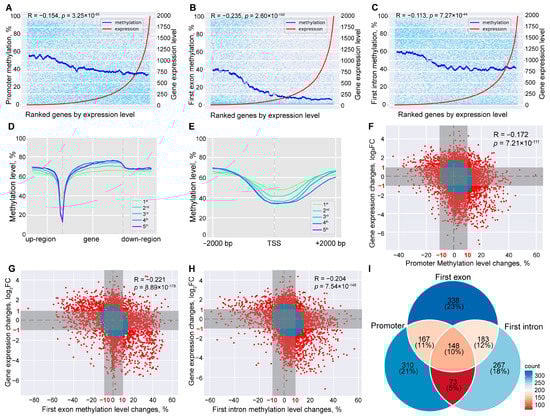 For the purpose of investigating the association between DNA methylation and gene expression, we first calculated the methylation levels of genic structures (promoter, first exon, first intron, gene body, exons, and introns) for each gene as the arithmetic mean of the methylation level of all qualified CpG sites. The DNA methylation level of promoters, first exons, and first introns was significantly negatively correlated with gene expression levels at a scale of the whole genome (p < 5 × 10−8) (Figure 3A–C). Globally, the higher the expression level of genes, the lower the methylation level at their regulatory regions (promoter, first exon, and first intron). Furthermore, the classic valley-like changes in DNA methylation around TSSs also showed possible associations with the gene expression level, in that the higher the expression level of genes, the steeper their methylation level change is around TSSs (Figure 3D,E).