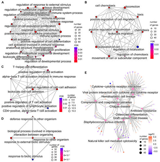 Functional enrichment for differentially methylated and expressed genes (DMEGs). (A–D) The biological processes gene ontology (BP-GO) terms significantly enriched by DMEGs, showing significant clustering based on similar functions. (A) The first cluster of BP-GO terms are processes related to immune responses and development processes; (B) The second cluster of BP-GO terms are processes related to cell activities, such as cell migration and movement; (C) The third cluster of BP-GO terms are relevant to T cell activities; (D) The firth cluster of BP-GO terms are processes related to defense responses to other organisms (the fourth cluster of BP-GO terms is found in Table S11A); (E) The KEGG pathways significantly enriched by DMEGs.