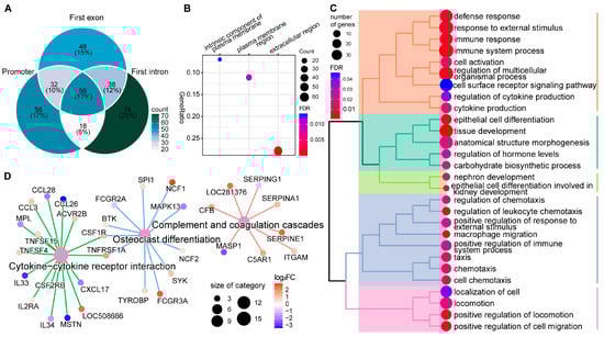 Functional enrichment for 322 differentially methylated and expressed genes (DMEGs) that overlapped with dMHBs. (A) Venn plot showing the integration of DMEGs which overlapped with dMHBs at their promoter, first exon, and first intron regions. (B) The three significantly enriched cellular component gene ontology (CC-GO) terms. (C) Tree plot of significantly enriched biological processes gene ontology (BP-GO) terms showing significant clustering based on pairwise similarities of the enriched terms. The orange color cluster (first from top) is related to immune and defense responses. The cyan (second from top) and green (third from top) clusters concern tissue development. The purple cluster (fourth from top) is related to chemotaxis processes and regulation of immune processes, while the pink cluster (fifth from top) is relevant to cell localization. (D) The significantly enriched KEGG pathways (large pink dots) and associated genes (smaller colorful dots).