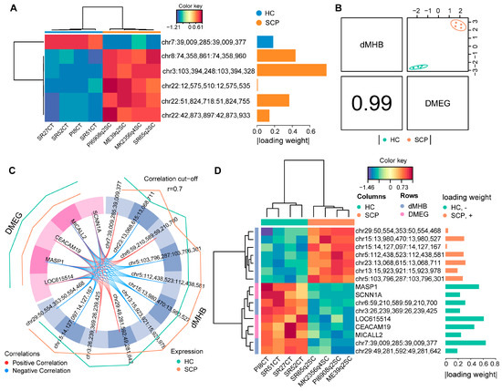 Identification of candidate discriminant signatures for SC subclinical mastitis. (A) Cluster and loading weight of six discriminant dMHBs selected by sPLS-DA. The orange and blue colors of the bar for absolute loading weight indicate higher methylation levels in SCP and HC groups, respectively. The greater the absolute loading weight, the more important the signature; (B) The strong correlation between the dMHBs and DMEGs discriminant signatures; (C) The significant and strong correlation (r > 0.7) between genetic and epigenetic discriminant signatures (11 dMHBs and 5 DMEGs) selected by DIABLO. The external lines indicate the methylation/expression level of corresponding signatures in SCP (cyan) and HC (orange) groups, while the outer line means a higher level; (D) Cluster and loading weight of discriminant signatures.
