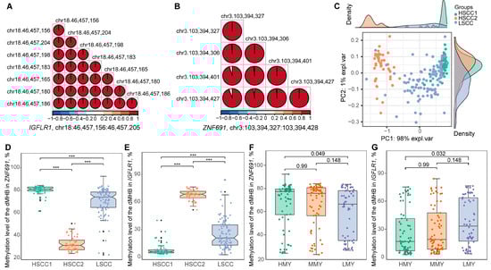 Validation of two dMHBs in a larger sample size (n = 200 cows). (A,B) The significant and strong correlation between CpG sites located in dMHBs chr18:46,457,156:46,457,205 (A) and chr3:103,394,327:103,394,428 (B), which overlapped with IGFLR1 (promoter) and ZNF691 (first intron), respectively; (C) PCA plot of methylation level of CpG sites detected in the two dMHBs showing clear clustering of cows, including clustering of HSCC cows into two groups- HSCC1 and HSCC2; (D,E) The significant different methylation levels of chr3:103,394,327:103,394,428 (D) and chr18:46,457,156:46,457,205 (E) between cows with different SCCs (proxy for mammary gland health condition). The high and low milk somatic cell counts are proxies for intramammary inflammation (HSCC1 and HSCC2) and good health (LSCC), respectively. “***” represents significant differences (p < 0.05) between corresponding groups; (F,G) The difference in the methylation level of chr3:103,394,327:103,394,428 (F) and chr18:46,457,156:46,457,205 (G) between cows with different milk yields, including high (HMY, ≥40 kg/day), median (MMY, 30–40 kg/day), and low (LMY, ≤30 kg/day) milk yields.