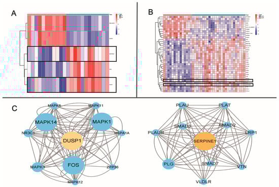 Atherosclerosis is a systemic disease. Although the risk factors and pathogenesis are similar, the pathological manifestations vary from site to site [13]. Whether differentially expressed genes promote a decrease in graft patency remains unknown. With RNA-sequencing data becoming increasingly publicly available, bioinformatics is increasing in importance in clinical research. Through transcriptomic analysis, the link between atherosclerosis and graft patency must be studied. Although the molecular mechanisms underlying the presence of femoral artery specificity remain unclear, we sought to identify differentially expressed genes (DEGs) and potential molecular pathways through bioinformatics. The GSE100927 dataset was obtained from the public GEO database of the American National Center for Biotechnology Information (www.ncbi.nlm.nih.gov/geo) on 10 June 2022. The microarray data of GSE100927 platform, based on the GPL17077 platform (Agilent-039494 Sure Print G3 Human GE v2 8x60K Microarray 039381), and series matrix file(s) were downloaded from the GEO and saved as TXT files. R software (version 4.2.1) was used to process the downloaded files. We selected 23 of these normal artery samples (containing 11 infrapopliteal and 12 femoral arteries) and 40 atherosclerotic samples (containing 14 infrapopliteal and 26 femoral arteries). Heat maps were plotted using the Limma software package (3.56.2) to display all up- and downregulated DEGs in the infrapopliteal and femoral arteries in the normal group and PAD patients, respectively. Adjusted p-values of <0.05 and fold change (logFC) of >1 were considered to indicate DEGs. A total of 5 DEGs were identified between the normal infrapopliteal arteries and normal femoral arteries (Figure 1A) and 37 were identified between the atherosclerotic infrapopliteal arteries and atherosclerotic femoral arteries (Figure 1B). Dusp1 and Serpine1 were upregulated in both the normal and atherosclerotic femoral samples compared with the infrapopliteal arteries. The functions of these two key hub genes and the KEGG pathway are shown in Table 1. The STRING database (https://cn.string-db.org/) is a precomputed worldwide resource for the exploration and analysis of interactions between known and predicted protein–protein interactions. The related genes, DUSP1 and SERPINE1, were separately selected on 25 June 2022, and the correlations between DUSP1 and SERPINE1 hub genes were visualized using the free visualization software tool Cytoscape 3.9.1 (Figure 1C). Both DUSP1 and SERPINE1 play important roles in the TGF-β signaling pathway, as shown by protein interaction networks and the KEGG analysis of genes.
