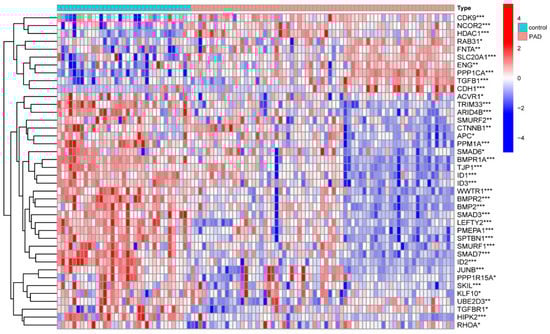Bioinformatics analysis of TGF-β-related genes in PAD and control vessels. Differential analysis of TGF-β-related genes in PAD and normal vascular tissues. *** p < 0.001, ** p < 0.01, and * p < 0.05.
