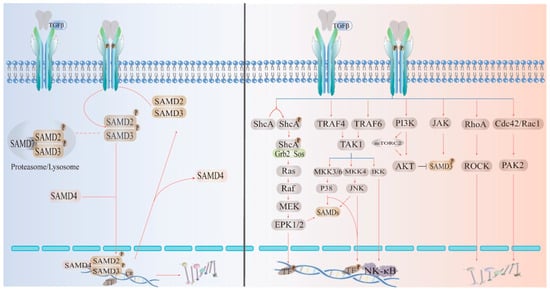 The TGF-β cytokine family is ubiquitous and plays an important role in inflammation, repair, and immunity; this family is essential for the development of the body. In general, TGF-β has a stimulatory effect on the cells of mesenchymal origin and an inhibitory effect on the cells of epithelial/neuroectodermal origin. Dysregulation of the TGF-β downstream pathway leads to the development and progression of cancer and fibrotic diseases [17,18]. TGF-β belongs to the peptide family and has three types of receptors (β1: homodimer; β2: homodimer; β3: heterodimer), which play different roles according to the effects of different ligand signals. Among them, TGF-β1 has been extensively studied due to its important role in immunity and fibrosis [19]. TGF-β2 and TGF-β3 are less expressed in mammals, but TGF-β2 plays an important role in glucose and fatty acid metabolism. Because TGF-β3 is similar to TGF-β1 in immunity, it is expected to be a focus in future disease research [20,21]. The two main TGF-β signaling pathways are the canonical (Smad-dependent) and noncanonical (Smad-independent) pathways. The canonical (Smad-dependent) signaling pathway is highly conserved. The ligand binds to the transmembrane receptor on the cell surface to form an active TGF-β type II receptor and phosphorylates the GS domain (rich in glycine and serine residues) in TGF-β1. After GS phosphorylation, it recruits the receptors regulating Smad2 and Samd3. R-Smads form an active complex with Smad4 and transport it to the nucleus to regulate the transcription of target genes. Smad7 may be recruited into the complex of activated Smad2/3 to initiate their degradation by Smad-specific ligases, which, in turn, prevents them from being transcribed. Among the noncanonical pathways, the diversity of intracellular TGF-β signaling depends not only on the type of ligand, receptor, Smad mediator or Smad-interacting protein but also on the ability of TGF-β to activate other signaling pathways, such as P38, MAPKs, ERK, AKT, and so on [22,23,24]. Both the canonical and noncanonical pathways have been extensively discussed and validated (Figure 3).