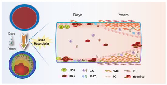 Time course of intimal hyperplasia after vein graft. Vein graft procedure leads to endothelial injury, which immediately results in platelets and thrombosis. Over time, inflammatory cells attach and infiltrate the fibrin layer and intima. Secretion of cytokines, including PDGF and TGF-β, activated smooth muscle cells in the media, and fibroblasts in the adventitia, start migrating toward the intima and induce extracellular matrix deposition, forming the intimal hyperplasia. EPC: endothelial progenitor cell; RBC: red blood cell; CK: cytokines; EMC: extracellular matrix cell; SMC: smooth muscle cell; EC: endothelial cell; and FB: fibroblast.
