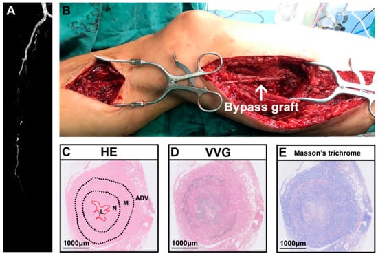 Representative case of saphenous vein graft failure after bypass surgery for peripheral arterial disease. (A) Preoperative computerized tomography angiogram (CTA) of person with PAD. (B) Intraoperative saphenous vein bypass surgery. (C) Representative hematoxylin and eosin (HE) staining showed obvious inward vascular remodeling accompanying narrowed vessel lumen. (D) Representative VVG staining showed broken elastic fibers. (E) Representative Masson’s trichrome staining showed obvious fibrosis in vessel wall. HE, hematoxylin and eosin; VVG, Verhoeff–Van Gieson staining; ADV, adventitial layer; M, media layer; N, neointimal layer; L, lumen. White arrow indicates bypass graft.