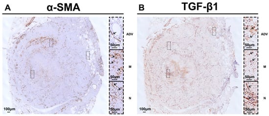 Moreover, we noted α-SMA-positive cells in the whole vessel wall (Figure 6A). The positive TGF-β1 staining (Figure 6B) was observed almost everywhere, in agreement with Masson’s trichrome staining. This implied that the TGF-β1 signaling may be linked to several cellular types. Further experiments need to be designed to reveal the complex cellular biology.
