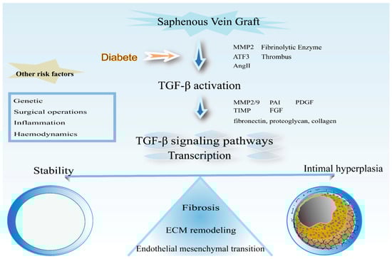 In clinical practice, patients with combined systemic vascular diseases such as diabetes and hyperlipidemia have a higher susceptibility to lower limb ischemia, which is possibly related to the molecular mechanisms of accelerated vascular fibrosis and intimal hyperplasia [85,86,87,88]. Diabetes can cause a high rate of vascular damage, with intimal hyperplasia, stenosis, and subsequent fibrinoid degeneration of the vessels from small arteries. A total of 20% of people with PAD have a combination of diabetes and are more likely to develop intimal hyperplasia and restenosis of the vessels after surgery than healthy people [85,89,90]. Here, the main mechanism is insulin resistance, leading to endothelial insufficiency and accelerated platelet aggregation, which activates growth factors and promotes the proliferation of smooth muscle cells and inflammatory cells, thus causing intimal hyperplasia [91]. TGF-b can antagonize BMP-6 signaling and regulate smooth muscle cell differentiation, leading to enhanced intimal hyperplasia, as found in a mouse model of diabetes, by regulating circulating smooth muscle progenitor cells (SPCs), and TGF-β/BMP-6 expression promotes intimal hyperplasia in mice [92]. Connective tissue growth factor (CTGF) is a potent profibrotic factor and some of the downstream mediators of TGF-β. Modulating the TGF-β signaling pathway by targeting CTGF interference can help prevent intimal hyperplasia in diabetic large vessels [93]. An analysis of clinical data suggests that TGF-β1 may be a risk factor for endothelial hyperplasia and that restenosis is more severe in people with concomitant diabetes [94]. Advanced glycation end products (AGEs) accumulate with age in vascular tissues. AGEs increase extracellular matrix production by upregulating TGF-β and can interact with RAGs, which may lead to smooth muscle cell proliferation, extracellular matrix degradation, and the eventual production of intimal hyperplasia and restenosis [95]. In addition, genetic, surgical operation, inflammation, and hemodynamic factors are important risk factors.
