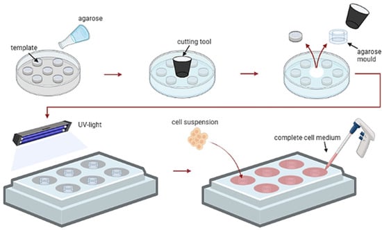 Schematic illustration of the generation of 3D spheroids by self-assembly of the cells in agarose micro-wells.