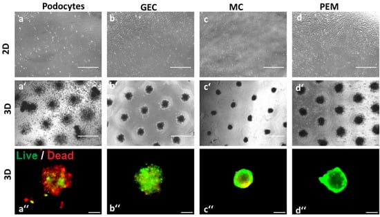 Mono- and co-cultures of differentiated, conditionally immortalized human podocytes (a); primary human glomerular endothelial cells (GEC) (b); primary human mesangial cells (MC) (c); and co-culture of all three glomerular cell types (PEM) (d) in 2D (a–d) or 3D (a′–d′) in agarose micro-wells display different morphology. Survival assay of spheroids (a″–d″). Living cells appear in green fluorescence and dead cells in red. Scale bar of (a–d,a′–d′) represents 750 µm and 100 µm for (a″–d″).