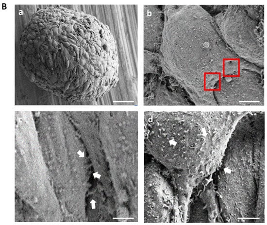 Spheroids were fixed for 1 h with 2% glutaraldehyde in 0.1 M Sodium cacodylate buffer, pH 7.4, rinsed three times for 15 min in 0.1 M sodium cacodylate buffer, pH 7.4 and post-fixed 1 h in 1% Osmium tetroxide in water following another three rinses in water. Dehydration was performed with an increasing series of ethanol (50% for 5 min, 70% for 5 min, 70% for 5 min, 95% for 5 min, two times 100% for 10 min). After dehydration, the cells were dried in a critical point dryer. Electron micrographs were taken with the Zeiss Auriga FIB/FE-SEM (AURIGA TM® Crossbeam Workstation, Carl Zeiss NTS GmbH, Oberkochen, Germany) microscope.