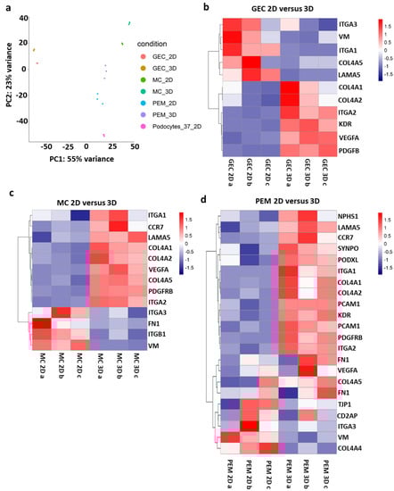 Comparison of transcriptomic data from glomerular monocultures and co-cultures between 2D and 3D culture conditions displays differences regarding cell type-specific marker, extracellular matrix and signaling components: (a) principal component analysis of glomerular cell monoculture and co-culture in 2D and 3D. Each condition was analyzed as a biological triplicate. Glomerular endothelial cell (GEC), mesangial cells (MC), co-culture of differentiated conditionally immortalized human podocytes, mesangial cells and glomerular endothelial cells (PEM); and (b–d) heatmaps representing gene expression of extracellular matrix components, cell type-specific markers, adhesion and signaling molecules of glomerular endothelial cell (GEC) monoculture (b), mesangial cell (MC) monoculture (c), and glomerular co-culture of podocytes, mesangial cells and glomerular endothelial cells (PEM) (d) in 2D and 3D. Each condition was analyzed as a biological triplicate.