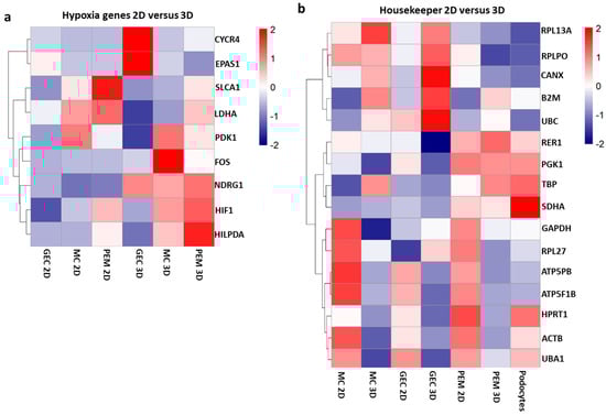 Bulk-RNA sequencing of glomerular monocultures and co-cultures in 2D and 3D exhibits differences in genes involved in hypoxia and housekeeping genes: (a) heatmap demonstrating expression of genes involved in hypoxia response in 2D and 3D monoculture of glomerular endothelial cells (GEC) and mesangial cells (MC) as well as 2D and 3D co-cultures of GEC, MC and differentiated, conditionally immortalized human podocytes (PEM); and (b) heatmap representing alterations of typically used housekeeping genes in 2D compared to 3D monoculture of GEC and MC as well as 2D and 3D glomerular co-cultures.