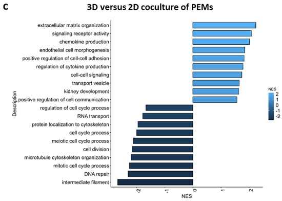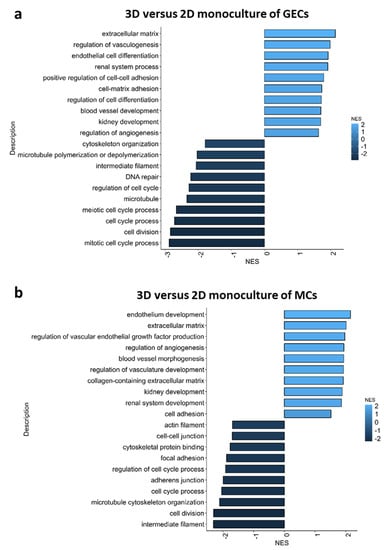 Pathway analysis of bulk-RNA sequencing data revealed that genes involved in extracellular matrix production, regulation of angiogenesis endothelial cell differentiation, cell matrix adhesion, cell–cell adhesion and kidney development were more active in 3D culture conditions. In contrast, gene pathways involved in cytoskeleton formation, DNA repair, cell cycle processes and cell division were less active in 3D cultures (Figure 6a–c).
