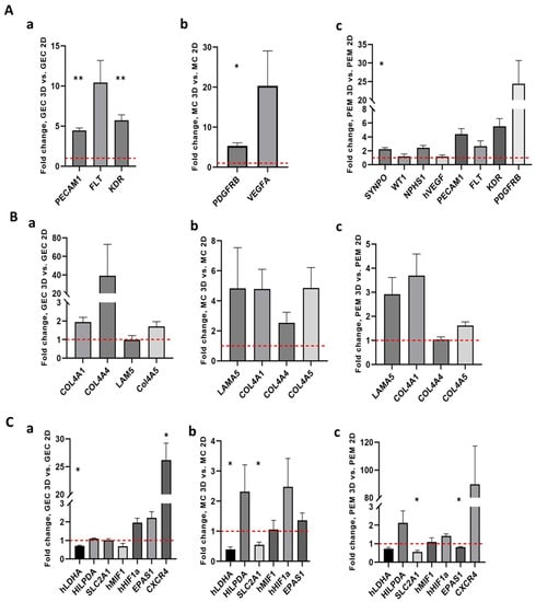 qPCR for cell type-specific markers, extracellular matrix and cellular response to hypoxia of 2D and 3D glomerular cultures. (A) qPCR for cell type-specific maker expression and cellular signaling: (a) comparison of glomerular endothelial cell (GEC) markers in 3D versus 2D monoculture of GECs; (b) Comparison of mRNA expression of mesangial cell (MC) markers in 3D versus 2D monoculture of MCs; (c) comparison of mRNA expression of podocyte, MC markers and GEC markers in 3D versus 2D glomerular co-cultures of podocytes, GECs and MCs (PEM). (B) qPCR for expression of extracellular matrix: (a) comparison of 3D versus 2D monoculture of GECs; (b) comparison of mRNA expression of extracellular matrix in 3D versus 2D monoculture of MCs; (c) comparison of mRNA expression of extracellular matrix in 3D versus 2D glomerular co-cultures. (C) qPCR for expression of hypoxia-related genes: (a) comparison between 3D and 2D monoculture of a: GECs and (b) mesangial cells; and (c) comparison of 3D versus 2D glomerular co-cultures. n = 3 for each experiment. Data are given as mean ± SEM, * p < 0.05, ** p < 0.01.