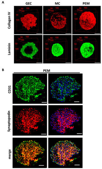 Multiphoton microscopy imaging of stained 3D glomerular spheroids displayed production of the typical glomerular extracellular matrix components collagen IV and laminin. These proteins were evenly distributed throughout the whole spheroid. 3D glomerular endothelial cell monocultures produced more collagen IV, whereas mesangial cell spheroids produced more laminin (Figure 8A). In 3D glomerular co-cultures, the endothelial cell marker CD31 was also located at the periphery of spheroids, while the podocyte marker synaptopodin was mostly found in the center of the spheroids. This is in line with the structural organization of the cells that could be observed before (Figure 8B).
