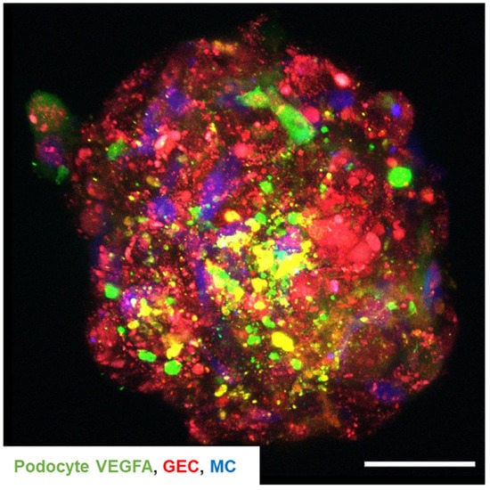 Glomeruli form the functional units of the kidney responsible for selective blood filtration. The glomerular filtration barrier is composed of a tri-layered structure of fenestrated glomerular endothelial cells, the glomerular basement membrane, and podocytes building the slit diaphragm [1]. Another important component of glomeruli are mesangial cells whose matrix contributes to glomerular integrity and stability [2,3]. Intraglomerular cell communication between different cell types is essential for the integrity of the glomerular filtration barrier and also for glomerular function and structure [4,5,6,7]. In the past, most basic research questions on glomerular cells concerning signaling pathways, response to different stimuli, and gene expression were either studied in mouse in vivo or in 2D monocultures of conditionally immortalized cell lines in vitro [8]. Despite their known advantages, transgenic mouse models have high maintenance costs, are time-consuming and ethically questionable. In contrast, conventional 2D in vitro cell cultures are well-established, cost-effective, and easy to handle. However, they do not reflect the complexity of in vivo structures since the 3D architecture, intra- and cell–cell interaction and communication of the different glomerular cell types are missing. This results in an incomplete differentiation and a limited expression of cell type-specific markers, in particular podocyte markers [9]. Within the glomerulus, cells grow in a 3D environment with paracrine signaling of the glomerular cell types, which is not guaranteed in 2D monocultures. Data generated from classical 2D monocultures do not consider these limitations and, therefore, should be taken with caution.