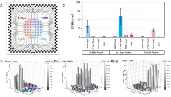 Specificity of three EGFR mutation targets on EFIRM microsensor. (A) Distribution of three EGFR targets and blank control on the sensors. EFIRM reading with sensors coated with single EGFR probe for (B(i))-L858R; (B(ii))-Ex19del; (B(iii))-T790M for each individual electrode. Color maps are provided to indicate the EFIRM current reading. (C) Averaged amperometric signal reading from L858R/Ex19del/T790M-coated sensor from each group on targets; two standard deviations are included in the error bar.