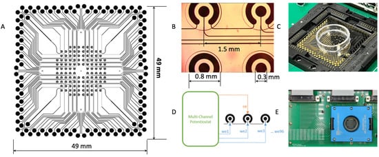 A custom adapter was designed to interface the microchip with a multichannel potentiostat (Figure 4D,E) (IVIUM CompactStat.h with 3 multiWE32, Eindhoven, The Netherlands). The potentiostat can control and measure the 96 electrodes simultaneously.