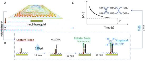 The whole procedure is illustrated in Figure 5. All the capture probes were unlabeled. All the detector probes were biotinylated on the 3′ end. The capture probes (100 nmol/L) were first co-polymerized with pyrrole onto the bare gold electrodes by applying a cyclic square-wave electric field at 300 mV for 1 s and 1100 mV for 1 s for four cycles. The sensor was then washed with 1× PBST buffer (Thermo Fisher, Waltham, MA, USA). Hybridization was performed in 300 μL of ultra-sensitive hybridization buffer (Thermo Fisher Scientific, Waltham, MA, USA), spiked with a single oligonucleotide or a mixture of more than one. The EFIRM condition was 300 mV for 1 s and 500 mV for 1 s for a total of 150 cycles of 2 s, each followed by a 15-minute incubation at room temperature. After washing, the detector probes were mixed with casein-phosphate buffered saline (Invitrogen, Carlsbad, CA, USA) at a 1:100 dilution and transferred onto the electrodes. Subsequently, streptavidin poly-HRP80 conjugate (Fitzgerald Industries, Acton, MA, USA) was mixed with casein-phosphate-buffered saline (Invitrogen) at a 1:3 ratio and incubated for 15 min. Amperometric current was finally measured in TMB (3,3′,5,5′-tetramethylbenzidine) at −200 mV for 1 min.