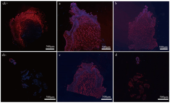 Detection of genomic DNA degradation and primary bud necrosis development via TUNEL assay. (a–d) TUNEL detection of primary bud necrosis at 50, 60, 67, 70 DABB; ck+ is a positive control with genomic DNA digested by the DNase Ⅰ, ck– is a negative control without TdT.