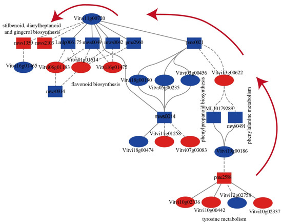 Metabolomic analysis showed a decrease in flavonoids, while lipids and stilbene showed an increasing trend (Figure 7). Stilbene and flavonoids belong to polyketides that are produced through the acetylation of p-coumaric acid in the phenylalanine metabolic pathway. Stilbene and flavonoids are polyketides produced by acetylation of p-coumaric acid in the phenylalanine metabolism pathway. Chalcone synthase (VvCHS) and stilbene synthase (VvSTS) have highly similar sequence structures and share the same substrates. The transcriptional regulation controls the carbon flux between these two opposing metabolic pathways [54]. The majority of VvSTS is located on chromosome 16, upregulated during primary bud necrosis (Supplementary Tables S6 and S7) [54]. The flavonoid hydroxylase VvCYP75A, along with CYP73A of the cytochrome P450 family, may participate in the hydroxylation of flavonoids, catalyzing the hydroxylation of flavonoid B ring 5′ to enhance tissue antioxidant defense and resulting in a significant decrease in flavonoid content [55,56].