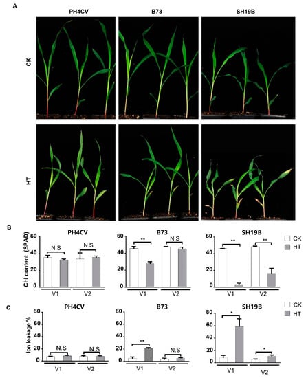 Differentially senesced phenotypes of PH4CV, B73, and SH19B seedlings upon heat treatment. (A) Senesced phenotypes of heat treatment (HT) and unstressed (CK) inbred lines; (B) chlorophyll contents (SPAD) of the respective organs; (C) ion leakage rates (%) of the above organs. V1 and V2 represent the first and second lobes from the bottom, respectively. Error bars represent ±SD (n = 3 biological replicates); “N.S” indicates no significant difference, “*” represents p < 0.05, “**” represents p < 0.01.