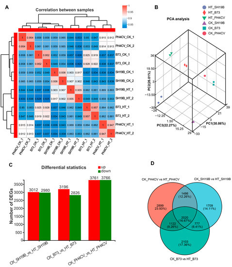 To explore the molecular basis of differential senescing phenotypes under heat stress, a transcriptome analysis was performed. A total of 12 cDNA libraries were constructed, which consisted of 12 leaf samples of the three inbred lines under HT as well as CK, with two biological replicates for each line. The libraries were then sequenced using Illumina Novaseq 6000 platform. A total of about 85.08 GB of clean data was finally obtained, with an average Q30 value of about 93.7% (Table S1). Using B73 genome (GCF_902167145.1) as a reference, 601 million reads were mapped. There were 84,127,307 (HT_SH19B), 87,847,433 (CK_SH19B), 80,954,154 (HT_B73), 86,897,700 (CK_B73), 87,499,572 (HT_PH4CV), and 90,918,674 (CK_PH4CV) clean paired-end reads used for future analyses (Table S2).