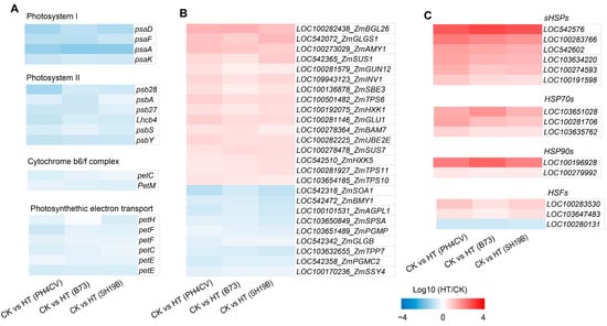 Genes with consistent expression trends in response to heat stress in the three inbred lines. (A) Expressions of photosynthesis-related genes (those involved in photosystem I, photosystem II, light complement complex, and photosynthetic electron transport) in the three inbred lines (PH4CV, B73, and SH19B) under heat treatment; (B) expressions of sugar-metabolism-related genes; (C) expressions of heat-response protein genes (sHSPs, HSP70s, and HSP90s) and heat-response transcription factor genes (HSFs). Each block represents the ratio of the expression of a gene under heat treatment (HT) to untreated (CK), Log10 (HT/CK). Red indicates upregulation, and blue indicates downregulation. The scale indicates the intensity of the colors.