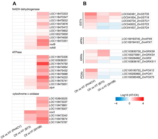 DEGs in response to heat stress in the three inbred lines. (A) The differential expression of oxidative phosphorylation pathway genes (including those involved in encoding NADH dehydrogenase, ATPase, and cytochrome c) in the three inbred lines (PH4CV, B73, and SH19B) under heat treatment; (B) the differential expression of antioxidant enzyme genes (GSTs, APXs, GRXs and POXs). GST, glutathione S-transferase; APX, ascorbate peroxidase; GRX, glutaredoxin; POX, peroxidase. Each block represents the ratio of the expression of a gene under heat treatment (HT) to untreated (CK), Log10 (HT/CK). Red indicates upregulation, and blue indicates downregulation. The scale indicates the intensity of the colors.