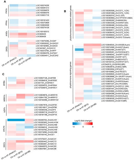 Differential responses of senescence-related genes to heat stress in the three inbred lines. (A) Differential expressions of plant phytohormone metabolism and signal transduction genes in the three inbred lines (PH4CV, B73, and SH19B) after heat treatment; (B) differential expressions of TFs (MYBs, WRKYs, bZIPs, bHLHs, and NACs); (C) differential expressions of Chl-catabolic genes (CCGs) and senescence-associated genes (SAGs). Each block represents the ratio of the expression of a gene under heat treatment (HT) to untreated (CK), Log10 (HT/CK). Red indicates upregulation, and blue indicates downregulation. The scale indicates the intensity of the colors.