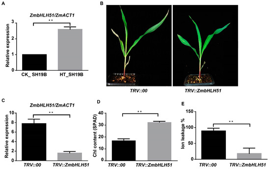 VIGS silencing ZmbHLH51 inhibited leaf senescence induced by heat stress. (A) The relative expression of ZmbHLH51 in heat treated (HT) and untreated (CK) SH19B, with ZmACT1 being used as an internal reference; (B) maize seedlings infected with TRV::00 and TRV::ZmbHLH51 after heat treatment; (C) the relative expression of ZmbHLH51 in TRV::00 and TRV::ZmbHLH51 plants after heat treatment, with ZmACT1 being used as an internal reference; (D) chlorophyll content (SPAD) in V2 leaves of TRV::00 and TRV::ZmbHLH51 after heat treatment; (E) Ion leakage rate (%) in V2 leaves of TRV::00 and TRV::ZmbHLH51 after heat treatment. Error bars represent ±SD (n = 3 biological replicates); “**” means p < 0.01.