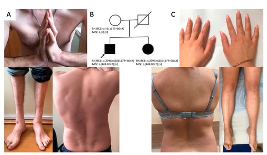 Clinical features of the proband: kyphoscoliosis, lower leg and hand muscle atrophy, hand joint contractures (A); genealogy (B); clinical features of the proband’s sister: mild hypotrophy of hand and foot muscles bilaterally, mild scoliosis (C).