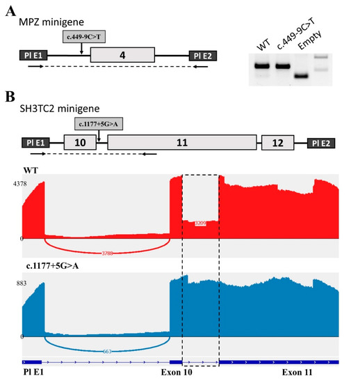 Minigene analysis of the c.449−9C>T variant in the MPZ gene and the c.1177+5G>A variant in SH3TC2. (A) Scheme of the MPZ minigene containing c.449−9C>T and electrophoregram of RT–PCR products. (B) Scheme of the SH3TC2 minigene containing c.1177+5G>A and Sashimi plots to visualize splice junctions for WT and c.1177+5G>A RT–PCR products of minigenes. Numbers represent the number of reads spanning the indicated exon/exon junction (EEJ).