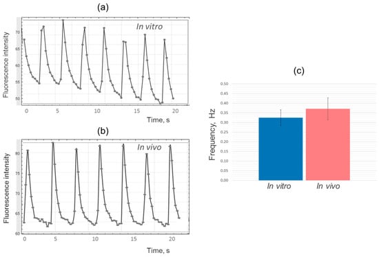 Figure 4a,b). The analysis revealed similarities in the shape and frequency of the peaks, indicating comparable dynamics of calcium ion fluxes and contraction frequency in iPSC-derived cardiomyocytes during the cultivation of cell layers in vitro and in vivo (