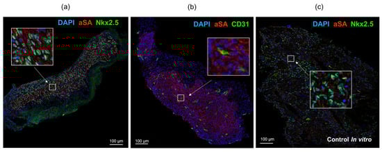Immunofluorescence staining of cardiomyocyte layers using antibodies against sarcomeric actinin and cardiomyocyte transcription factor Nkx2.5 revealed the presence of human cardiomyocytes that remained in SCID mice throughout the duration of the experiment (