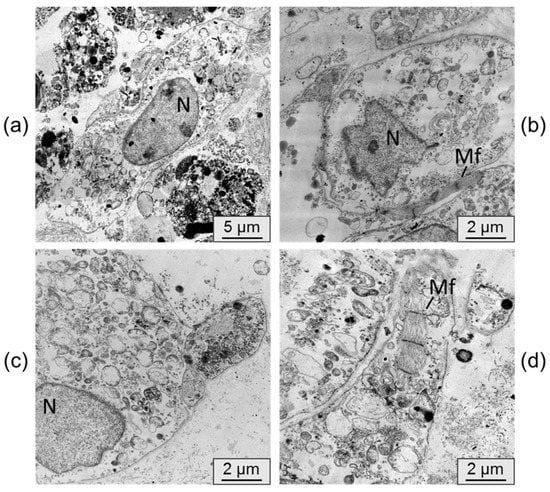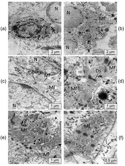 Fragments of cardiomyocyte cell layers were fixed in a 4% paraformaldehyde solution in Hanks’ medium. Subsequently, they were postfixed in a 1% OsO4 solution in PBS at pH 7.4 for 1 h. The samples were dehydrated using an ethanol series and then embedded in Epon ribbon (Thermo Fisher Scientific, Waltham, MA, USA). Semi-thin sections with a thickness of 1 µm were obtained using a Leica EM UC7 ultramicrotome (Leica Microsystems, Wetzlar, Germany). These sections were stained with toluidine blue and examined using a Leica DME light microscope (Leica Microsystems, Wetzlar, Germany) for preexamination. Ultra-thin sections, ranging from 70 to 100 nm in thickness, were cut using the Leica EM UC7 ultramicrotome (Leica Microsystems, Wetzlar, Germany). The sections were contrasted with a saturated aqueous solution of uranyl acetate and lead citrate. Digital photographs were captured using a JEM 1400 electron microscope (JEOL, Tokyo, Japan) at the Common Facilities of Microscopic Analysis of Biological Objects (ICG SB RAS, Novosibirsk, Russia).