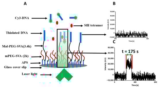 Schematic of TAPIN approach utilized to study the intermolecular interaction of SfiI–DNA using an objective-based TIRF microscope. (A) A DNA duplex is tethered to the glass surface through thiol chemistry, SfiI is present in the solution, and a fluorophore-labeled (Cy3) DNA duplex is added to the solution. The DNA substrates cannot interact without SfiI mediating the interaction and will not give any signal (B). However, when a complex is formed between SfiI and the two DNA substrates, a fluorescence burst, due to the association and dissociation of a SfiI–DNA complex within the evanescent field, is detected (C). The dwell time between association and dissociation events are recorded as the lifetime of the complexes.