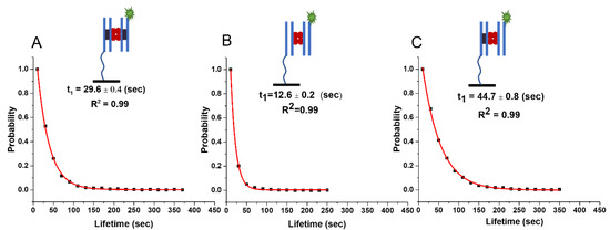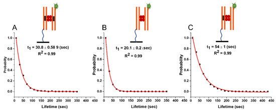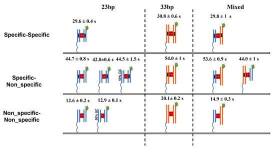 The results of our studies are summarized in Figure 5 and Table 1. The experiments with DNA duplexes of 23 bp revealed a substantially larger lifetime for specific DNA duplexes (29.6 ± 0.4 s) compared with non-specific ones (12.6 ± 0.2 s), which was also statistically significantly different using the Kolmogorov–Smirnov (KS) test at 0.001 confidence level (p-value~10−133). According to the theoretical model (Equation (7)), these lifetimes correspond to energies Es~3.2 kT and En~0.6 kT, respectively. Notably, according to the theory, due to small binding energy, the complex formed by non-specific duplexes is dynamic, so the protein might frequently change the locations on the duplexes. As a result of such dynamics, the theory predicts that the lifetime of the non-specific complex effectively increases for longer DNA substrate from 16 s to 20 s because of more possibilities for non-specific binding. This prediction perfectly aligns with the experiment produced for the duplexes with 33 bp, the lifetime being 20.1 ± 0.2 s. This observation is the first validation of the theory. Additionally, the approach predicts that the lifetime of a specific complex due to its high stability does not depend on the duplex size, which is also in line with the experiments in which lifetimes for specific duplexes with 23 bp and 33 bp are essentially the same, 29.6 ± 0.4 s and 30.8 ± 0.6 s, respectively.