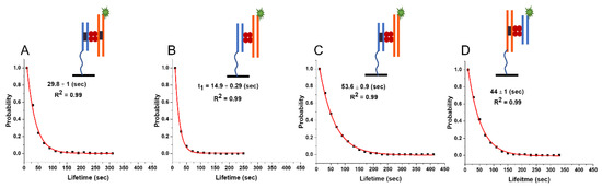 Thousands of events were collected for each SfiI–DNA interaction scenario, and the data was assembled into histograms. The characteristic complex lifetime was then estimated by fitting the histograms with a normalized survival probability analysis [27,28,29,30]. Kolmogorov–Smirnov (KS) test at 0.001 confidence level was performed between different lifetime obtained across different DNA substrates to establish the statistical significant difference.
