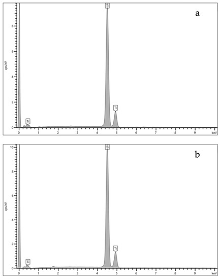 The EDS results for the titanium disc and the LB (Ti element) are shown in Figure 1a,b and the quantitative elemental composition (atomic %) is displayed in Table 1.