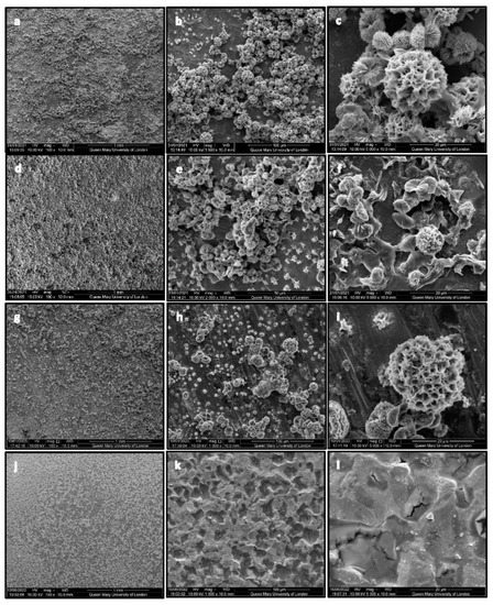 SEM photomicrographs of a copious coating of CHX-CaCl2 crystals on single coated Ti disc (a–c); double-coated Ti disc (d–f); lapped Ti disc (g–i) and Ti disc coated with Corsodyl (j–l).