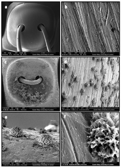 Figure 3a shows the uncoated Leonard Button (LB) displaying a coarse and columnar surface (Figure 3b). Figure 3c displays signs of some agglomerated spherical CHX-CaCl2 crystals on the LB’s concave surface and a uniform crystal distribution on its convex surface (Figure 3d). The CHX-CaCl2 crystals are growing in association with the LB’s surface flaws (Figure 3e). Figure 3f illustrates the unique spherical morphology of the crystals, with dendrites binding uniformly to the LB’s coarse metal surface. The intimate contact of the CHX-CaCl2 crystals’ tendrils at the LB surface interface is evident in Figure 3f.