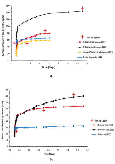 Mean cumulative CHXD drug release of: (a) of Ti disc (Grps. 1–4); (b) LB (Grps. 5–7). Plot values represent n = 3 readings at each time point.