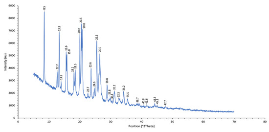 For X-ray Diffraction (XRD) analysis, the precipitated CHX-CaCl2 particles (Section 4.2) were reacted in 2 mL Eppendorf tubes (n = 6), then centrifuged twice for 1 min at 90 rpm (Eppendorf AG, Hamburg, Germany). The supernatant was removed and replaced with deionised water and recentrifuged. The CHX-CaCl2 particles were then freeze-dried at −100 °C, at 0.009 mBar for 1 day (ScanVac CoolSafe Freeze Drying, Allerød, Denmark). The CHX-CaCl2 particles were analysed using an X’Pert Pro powder diffractometer (Panalytical B.V., Almelo, The Netherlands). The reflective mode used power at a 45 kV tension unit and 40 mA as a current unit at a 6° angle, and the data were collected with an X’Celerator detector from 5° to 70° 2 Theta, with a step size of 0.005°.