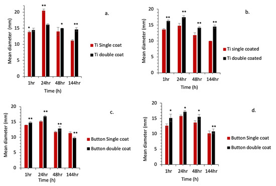 ZOI results for P. gingivalis strains on (a) coated Ti discs; (c) coated LB and for S. mutans strains on (b) coated Ti discs; (d) coated LB. * indicates a significant difference within groups (p < 0.05). ** indicates a highly significant difference within groups (p < 0.001).